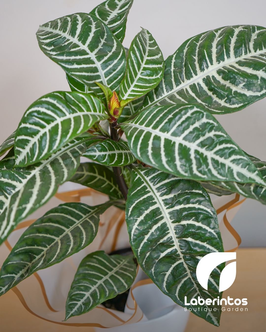 • Tiene hojas verdes brillantes con nervaduras blancas que parecen pintadas a mano.